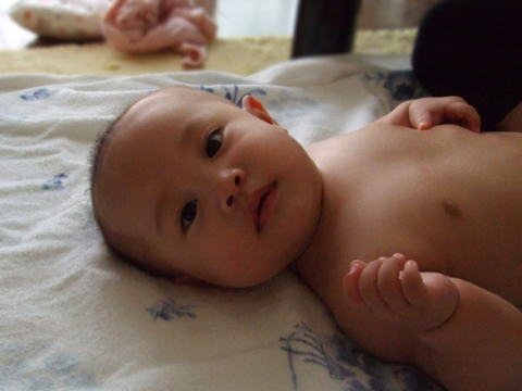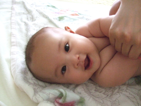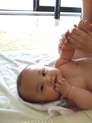 様子を見ながら、もう片足とお腹のマッサージ。ママの手つきはさっきよりも上手になっていて、赤ちゃんもママを見て笑顔でした(*^_^*)