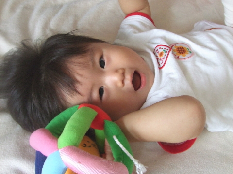 | こんにちは、とお部屋へお邪魔すると、お座りをしておもちゃで遊んでる姿が! おもちゃは、お座りの練習にいいかも、と買ったそうです。 2週間ぶりですが、急に大きくなったようでびっくりしました。 |