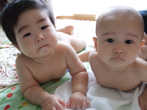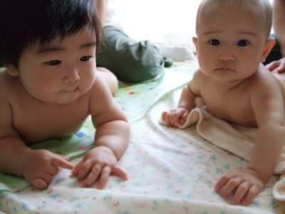 子ども達の成長の早さには毎回びっくりです。ふたりとも、寝返り大好き♪